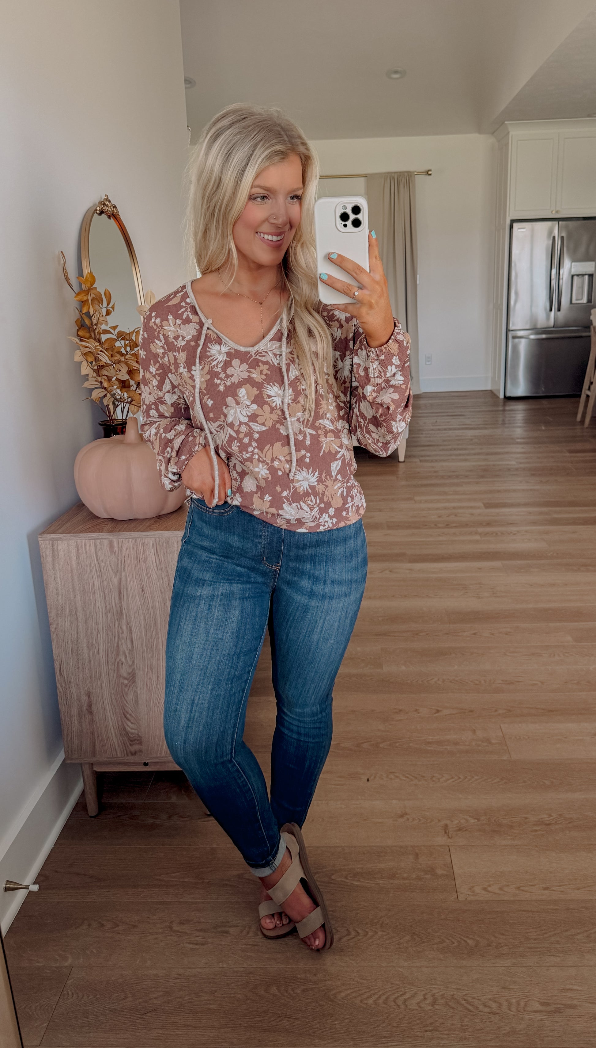Modern and minimalist, this blouse has a sleek tie-neck that can also be untied, floral design fabric in a gorgeous mix of brown, cream, and taupe. Perfect for layering underneath a cardigan for those chilly mornings!