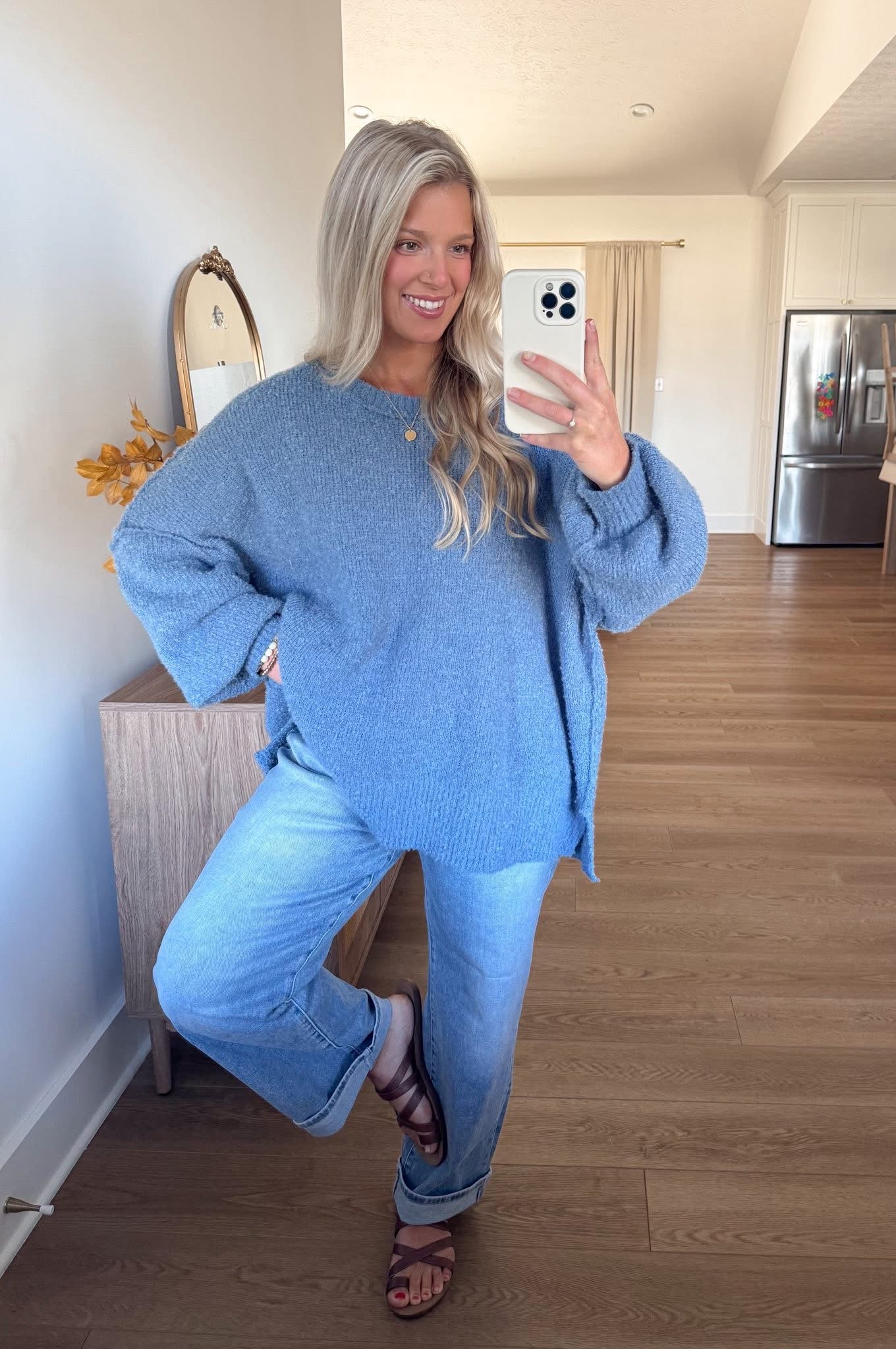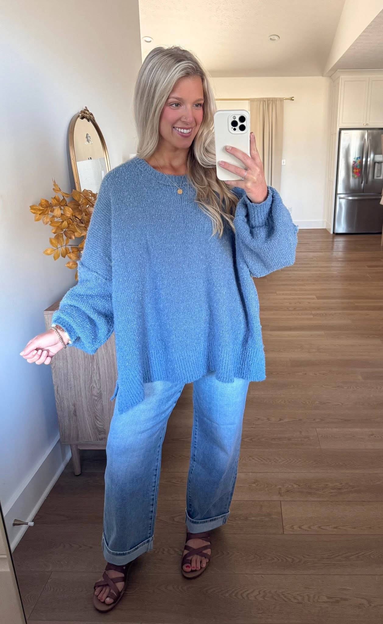 The BelleRose Steel Blue Knit Sweater brings cozy charm with a modern twist. Made from soft dusty blue knit fabric, this sweater offers a relaxed silhouette with subtle side slits for added movement. The classic round neckline complements the playful long balloon sleeves, making it both comfortable and stylish. Perfect for pairing with jeans or skirts, this versatile piece is an easy choice for cool, casual days.