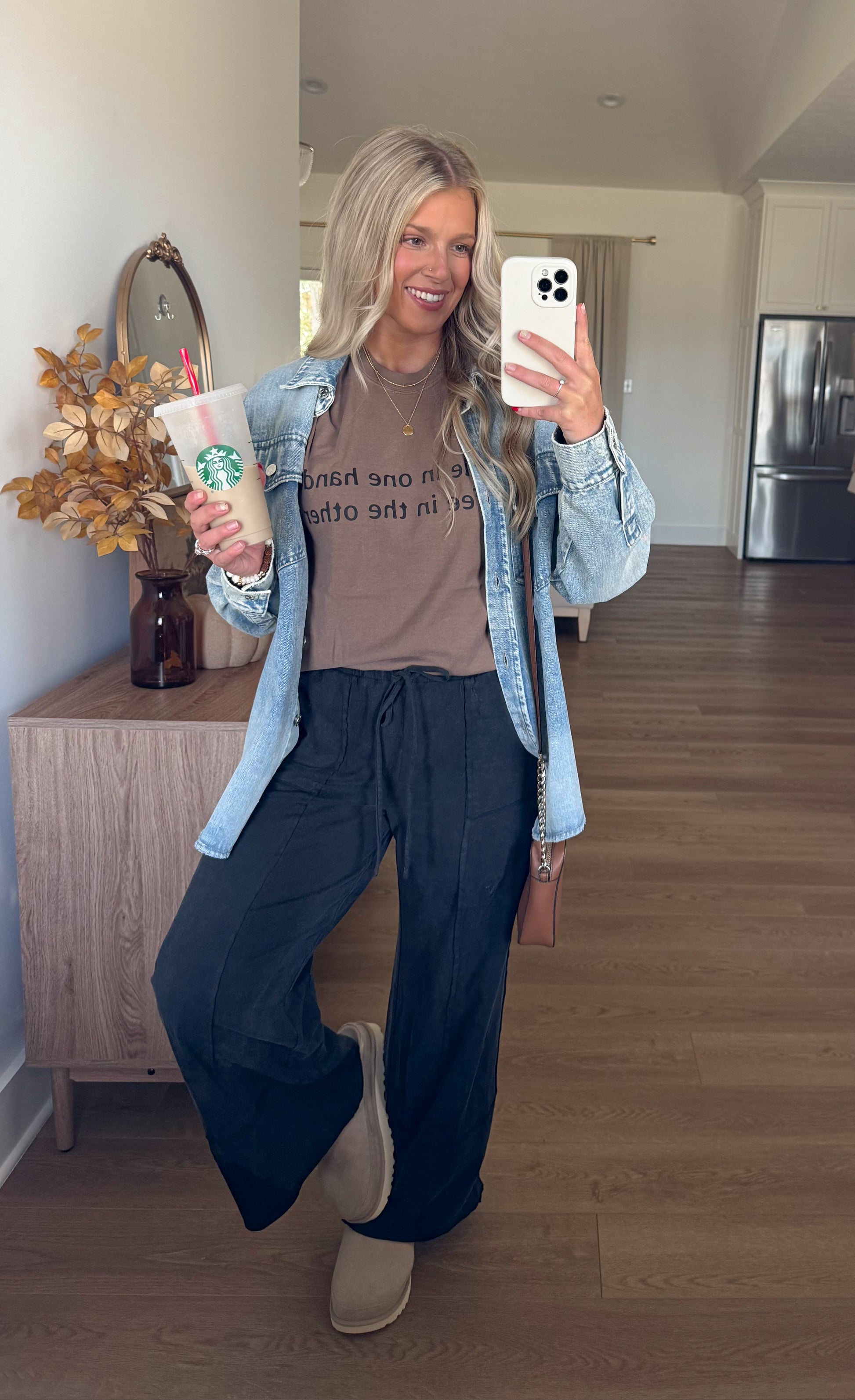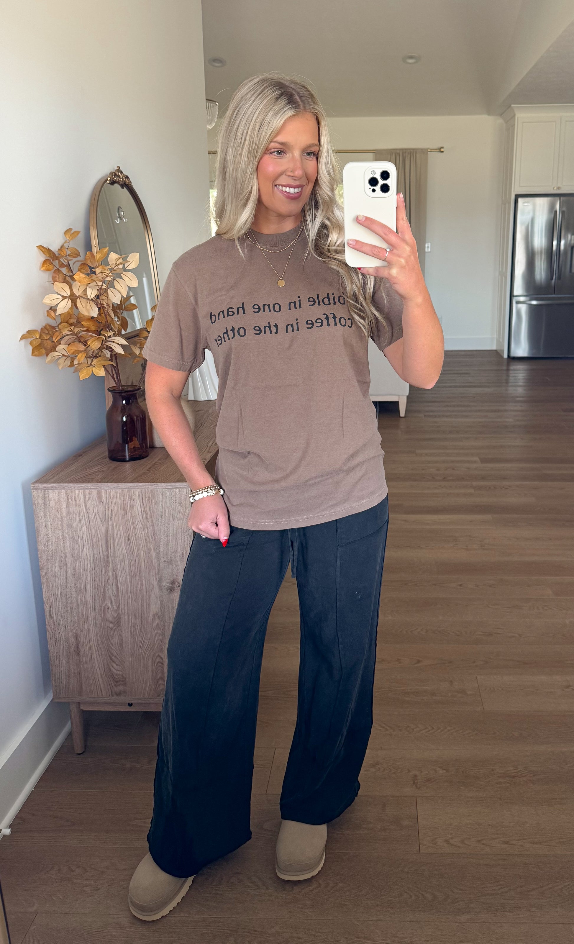 “Bible In One Hand, Coffee In The Other” ☕️📖printed on this gorgeous espresso colored tee! Style this with your favorite comfy lounge pants and a chunky knit cardigan, or denim the options are endless!