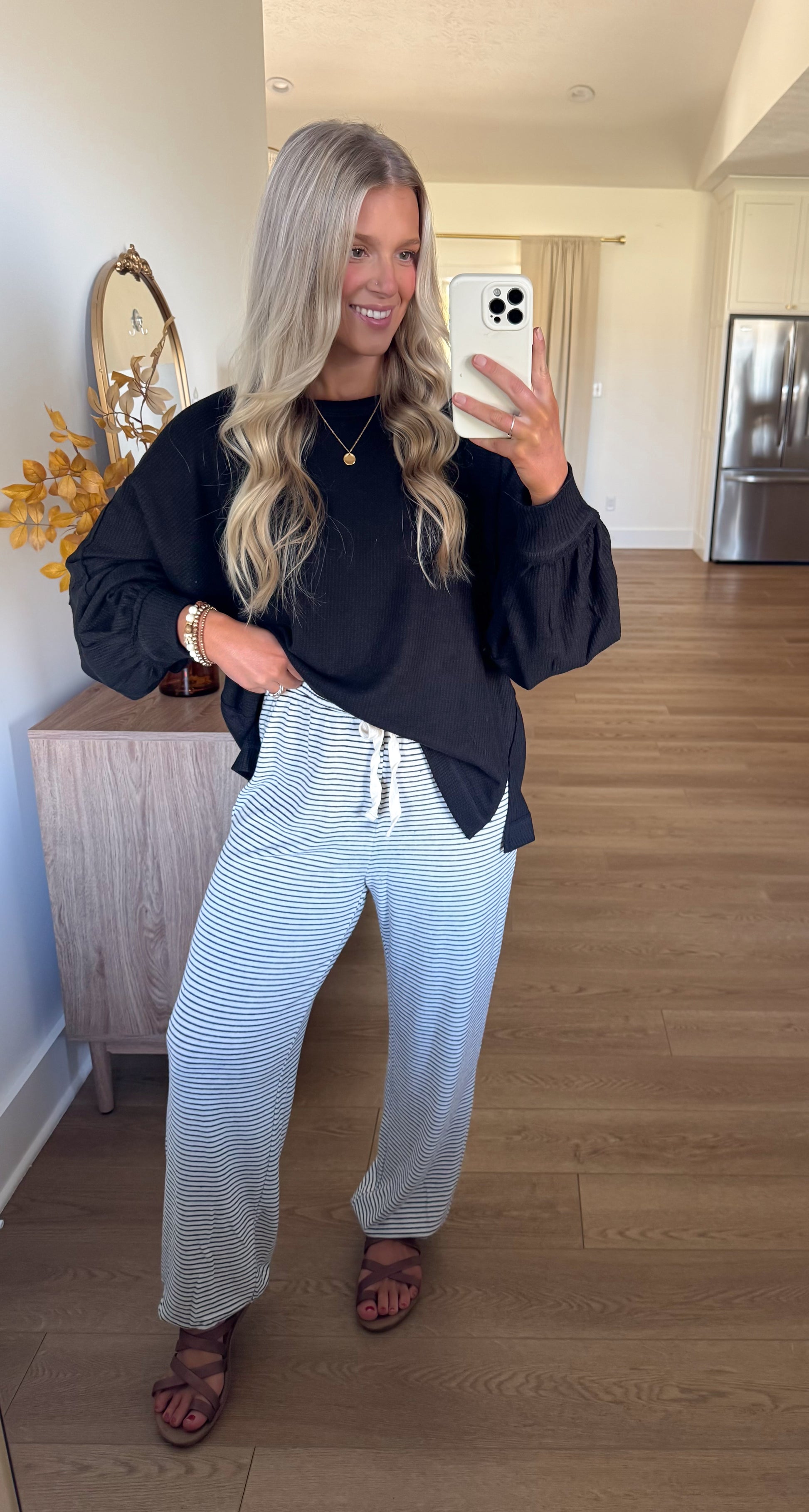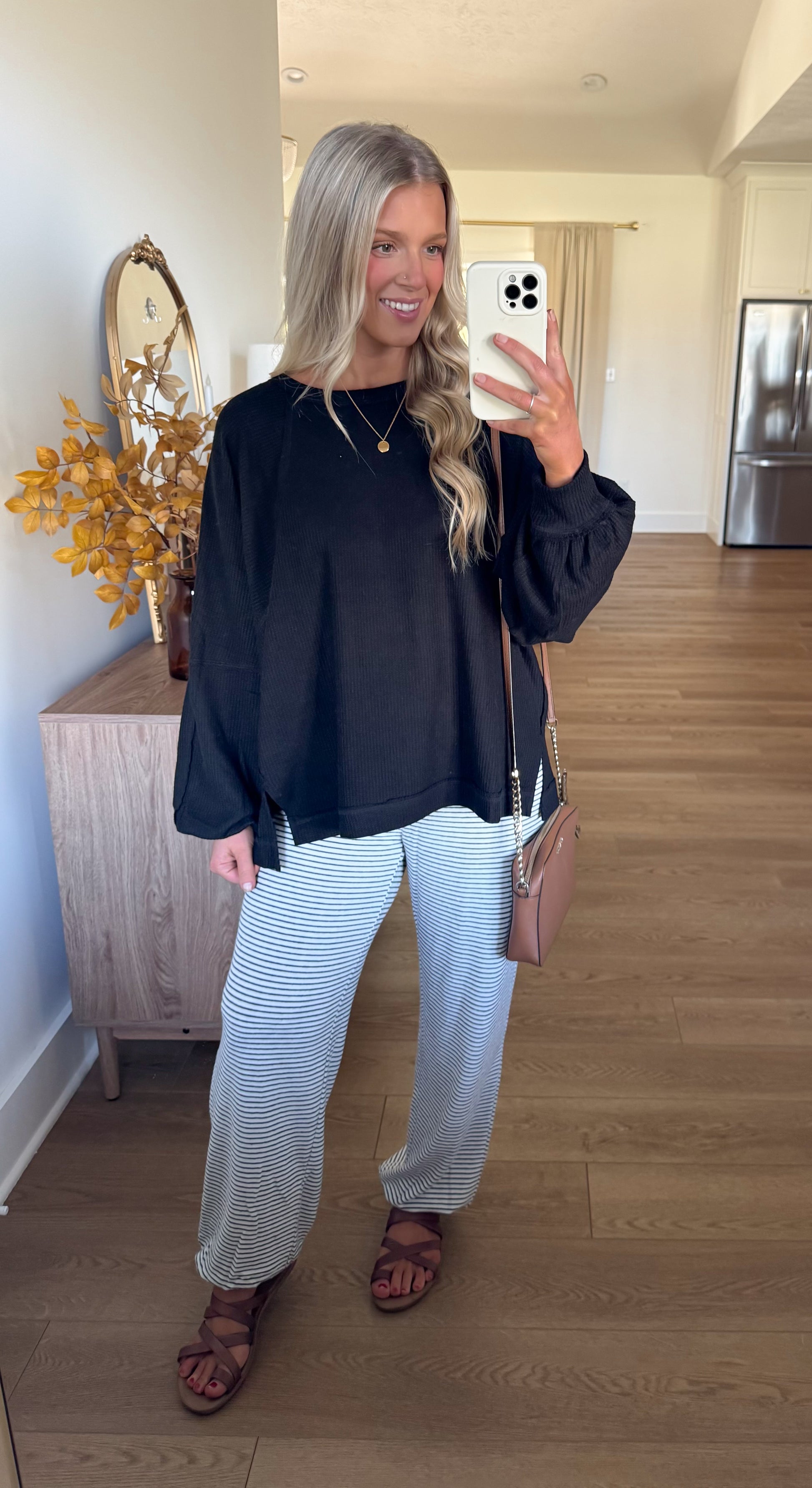 Experience cozy sophistication with this brushed waffle top, perfect for effortlessly chic comfort. Its soft texture ensures easy wearability, while the loose sillhoute and sleeves offer a relxed fit.