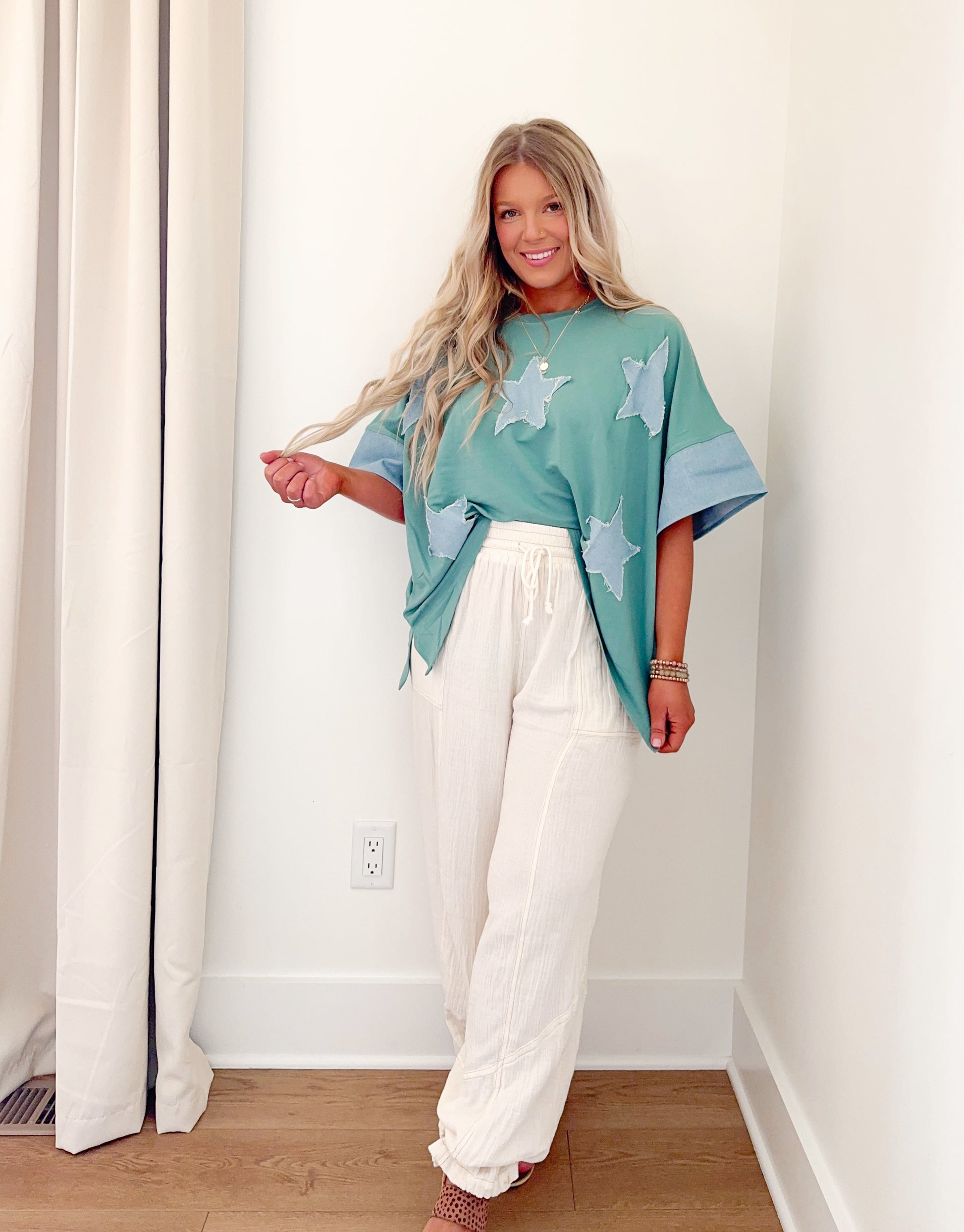 Upgrade your wardrobe with The Star Denim Top. Enjoy butter soft fabric and unique star raw hem detailing. Effortlessly stylish with fun color combo, this top boasts a relaxed and oversized fit for ultimate comfort. Denim sleeves add an extra touch of trendiness.