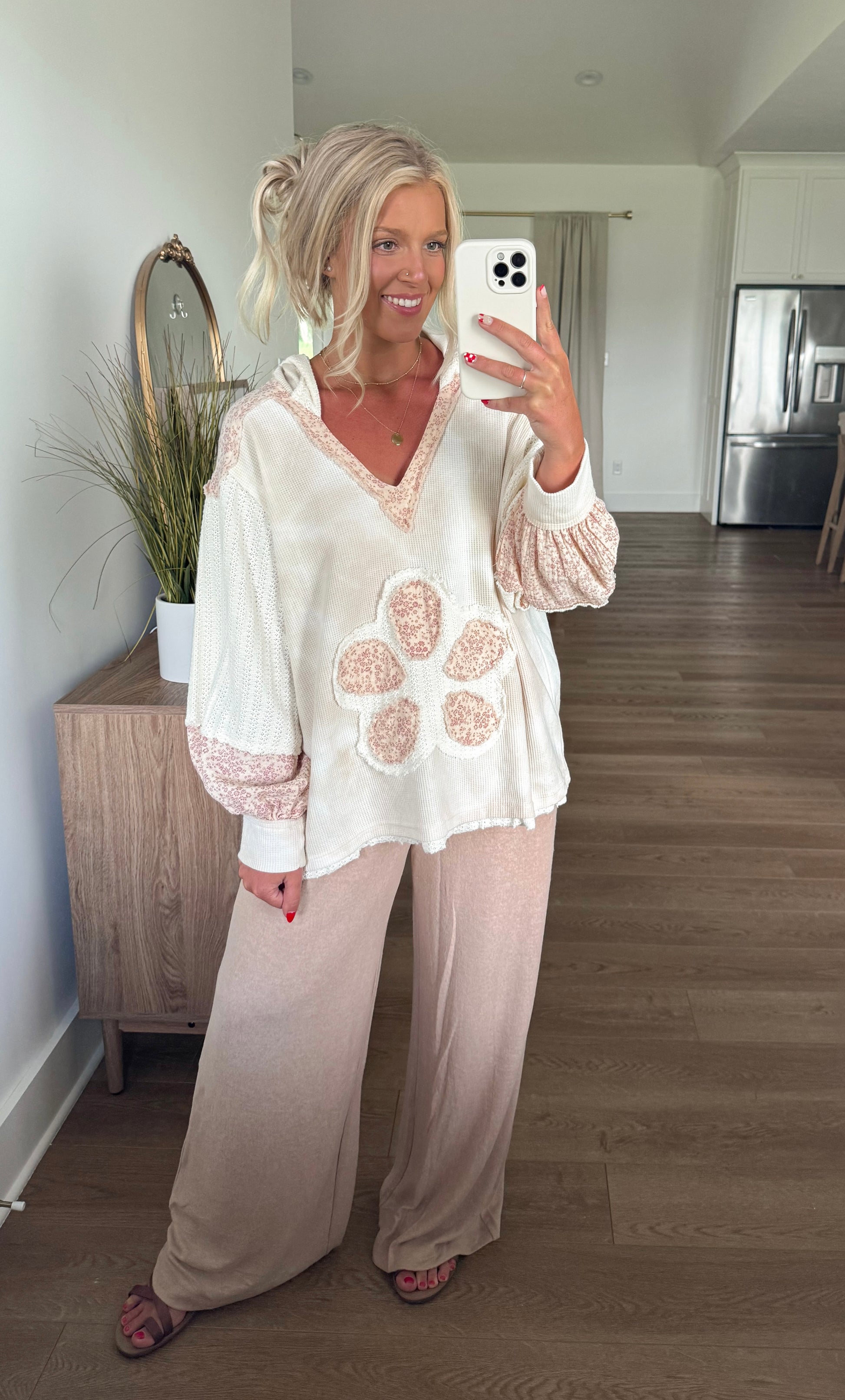 Elevate your casual wardrobe with our V-neck balloon sleeve hoodie. This relaxed fit top features a thermal fabric for ultimate comfort, along with unique cut and sew details like a cozy sweater knit patch and printed gauze flower patch. The raw edge and vintage washing add a touch of edginess to this versatile piece.