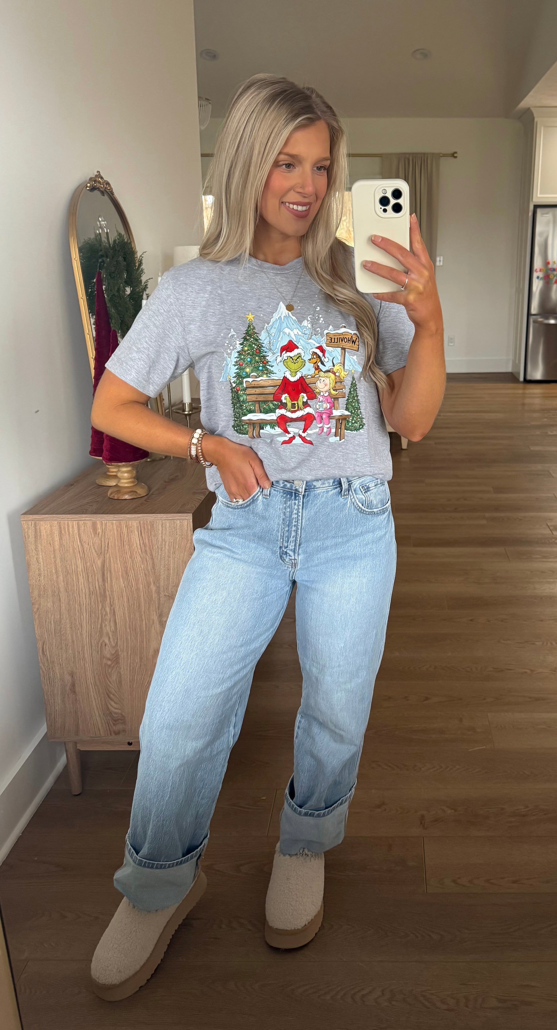 The perfect print for my all our Grinch lovers - Super cute and the colors pop! This is printed on a heathered grey tee.