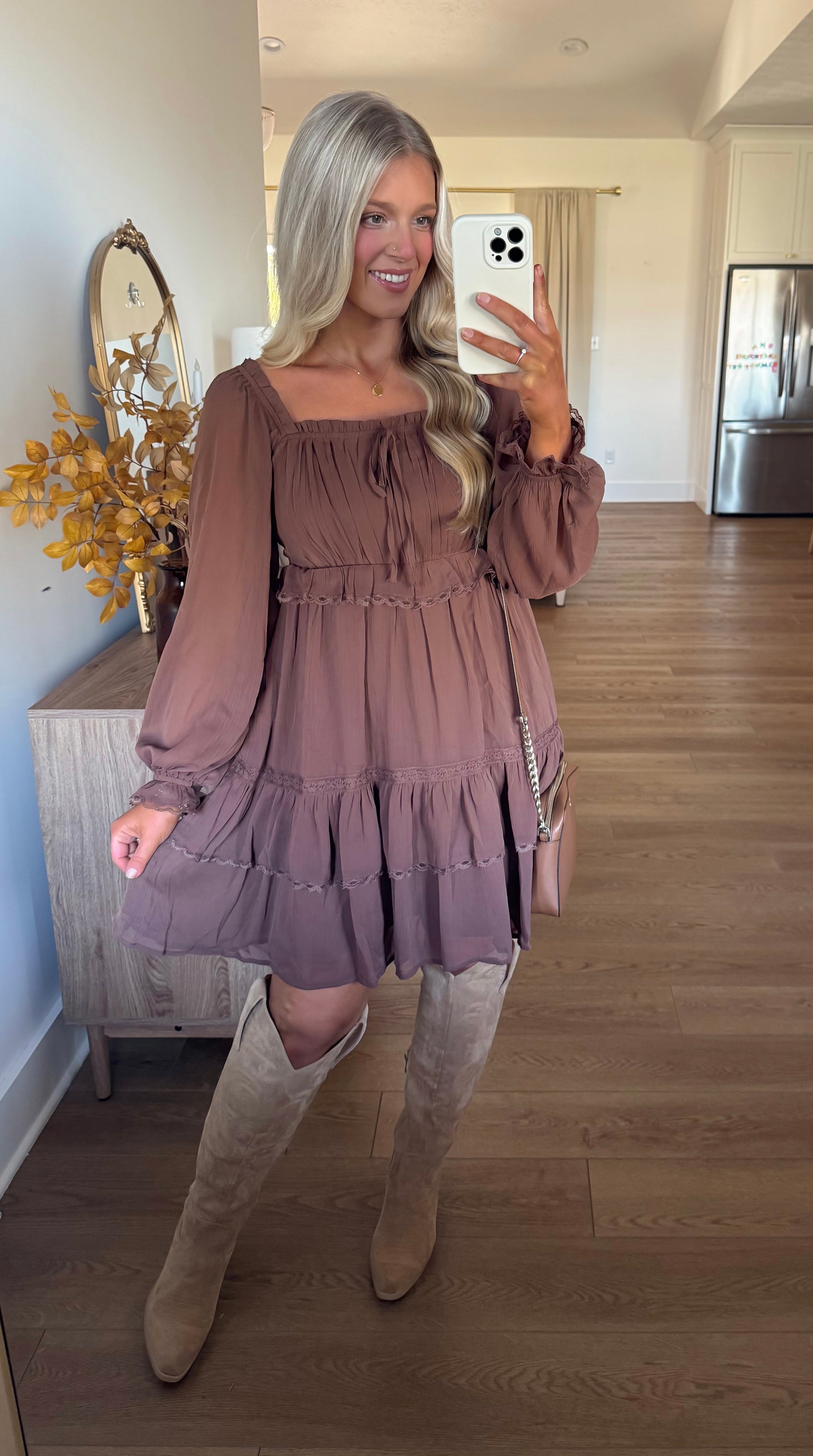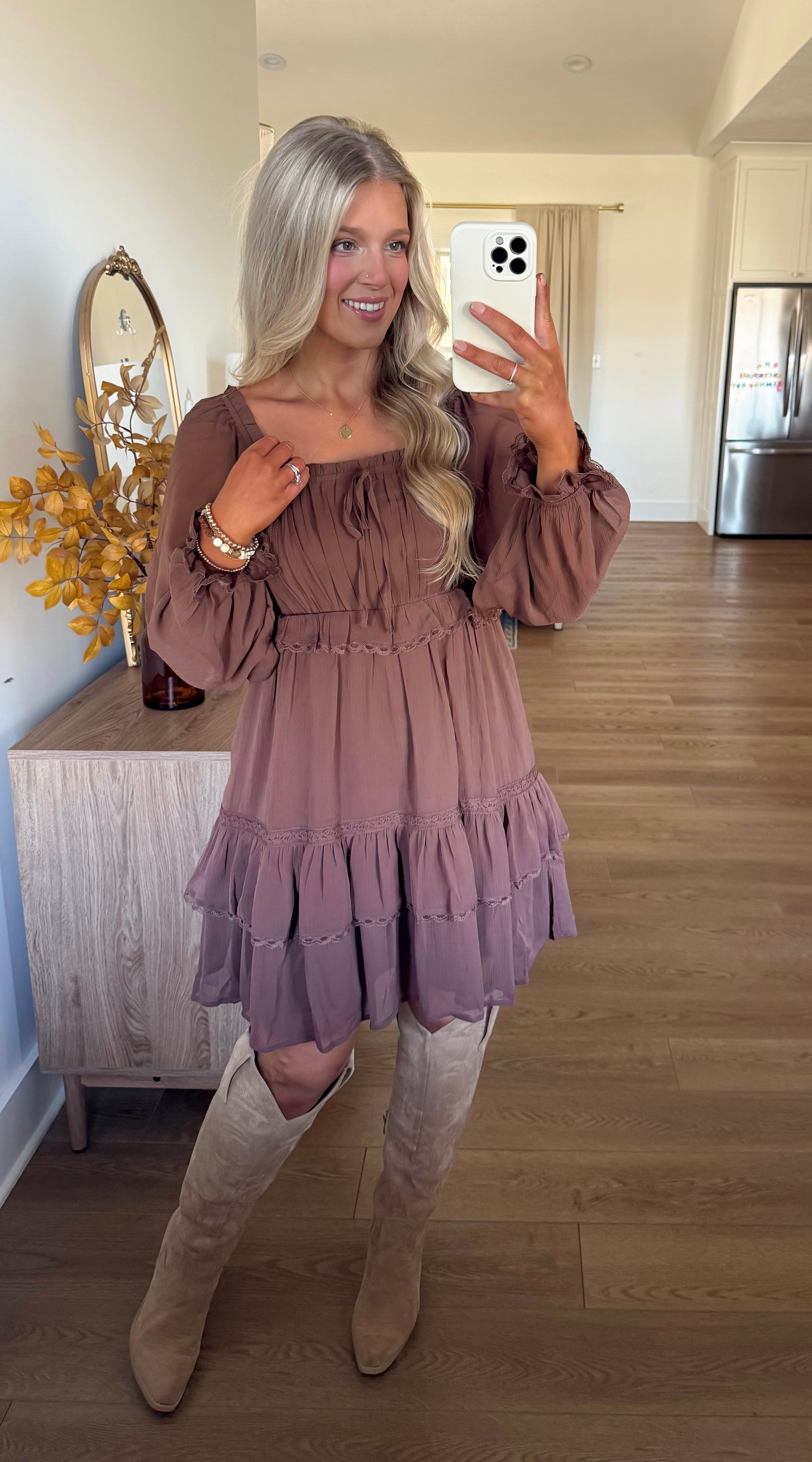 Our "Honey Haze" dress features a smocked back, a tiered skirt with lace trim, side seam pockets, and a fully lined body.