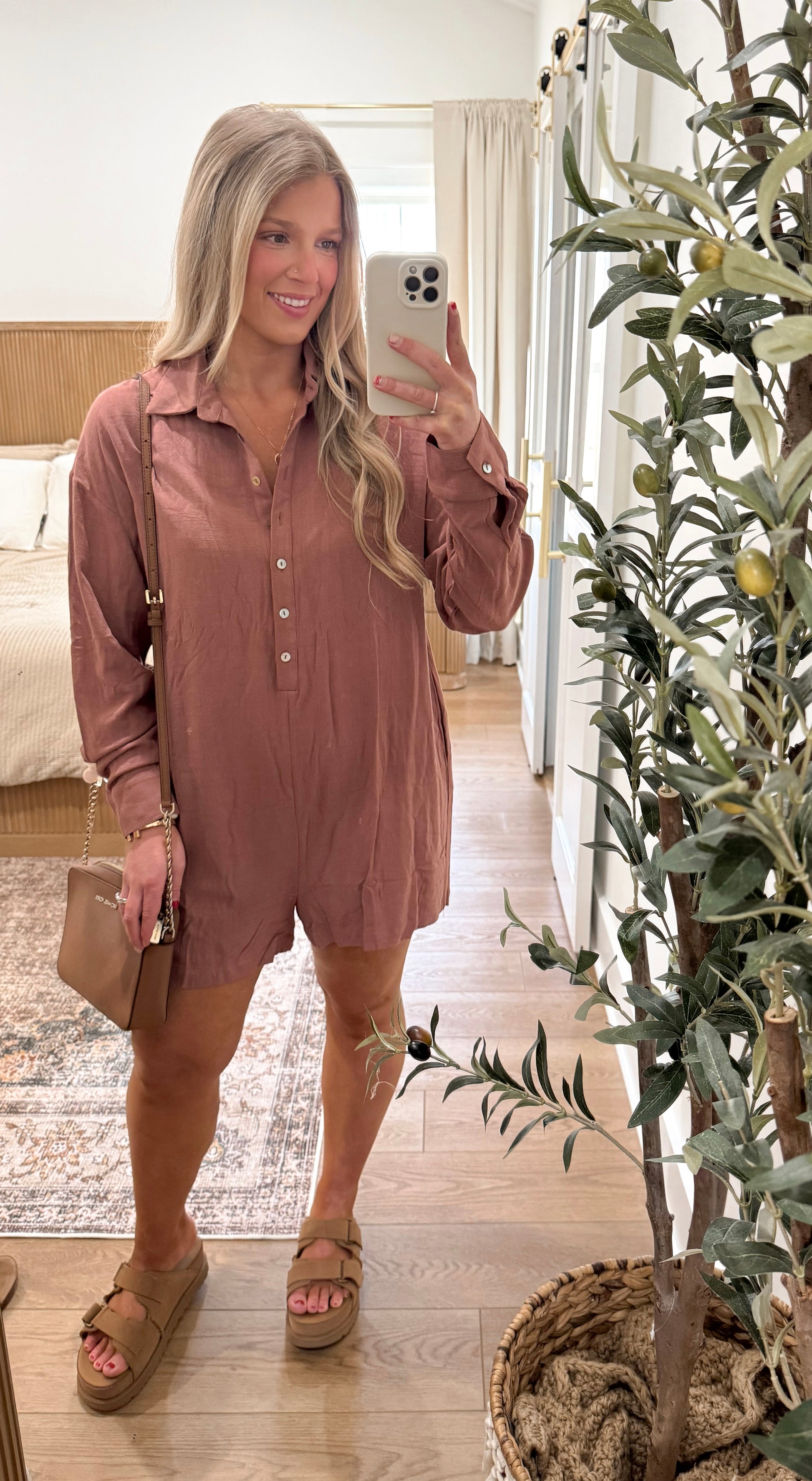 Unleash your playful side in this Boxy Linen Long Sleeve Romper. Made with functional buttons for easy wear, this romper also features side pockets for convenience and is lined for added comfort. Perfectly combining style and functionality, this romper is a must-have.
