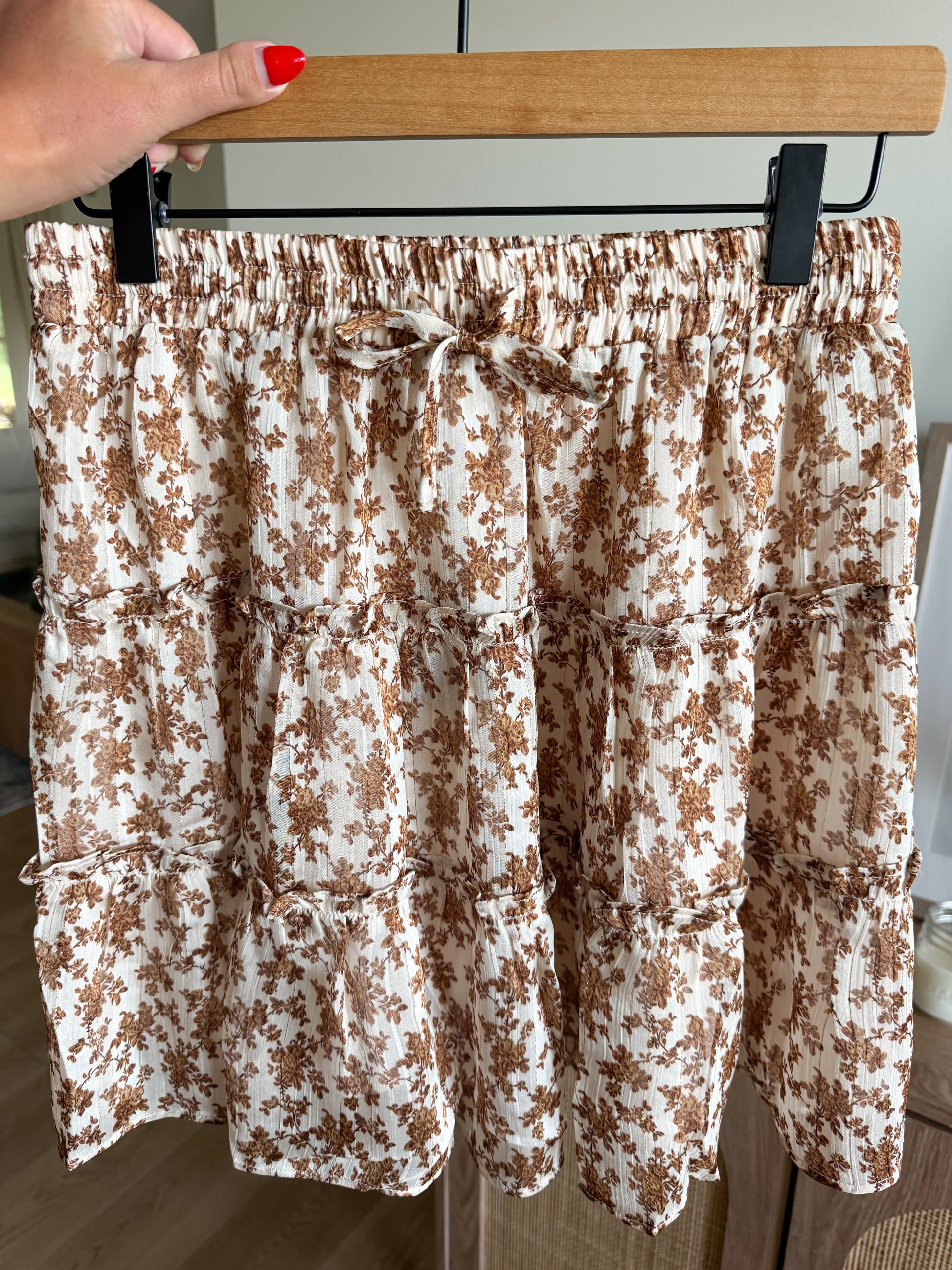 Sweet ruffle tiered mini skirt covered in a neutral floral print. Metallic gold threading adds the perfect amount of shine! The pull-on elastic waistband has functional drawstring ties.