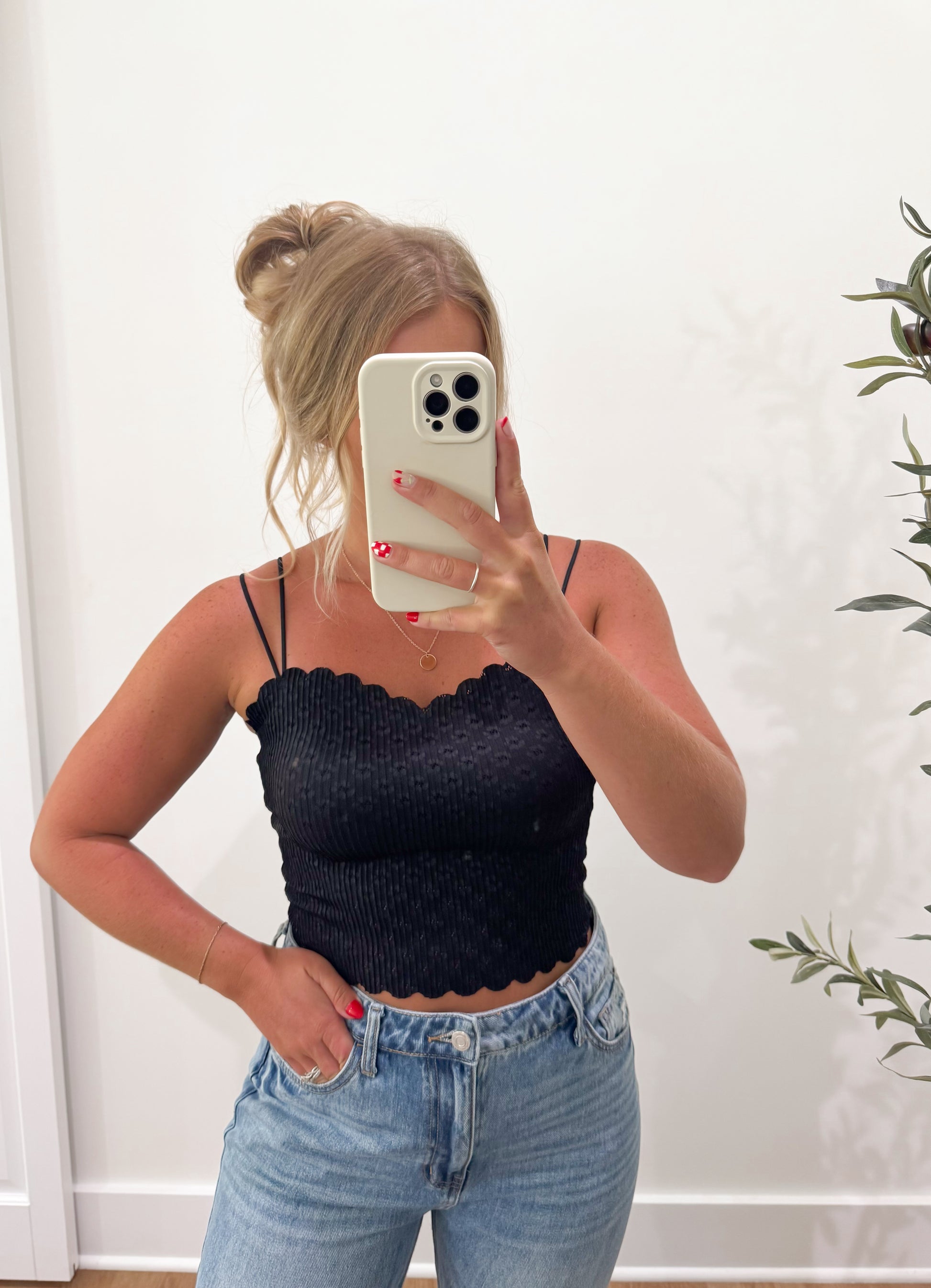 Black seamless padded tank with scalloped edges! This tank is very comfortable, stretchy, and perfect for wearing on its own or layering under jumpsuits and jackets.