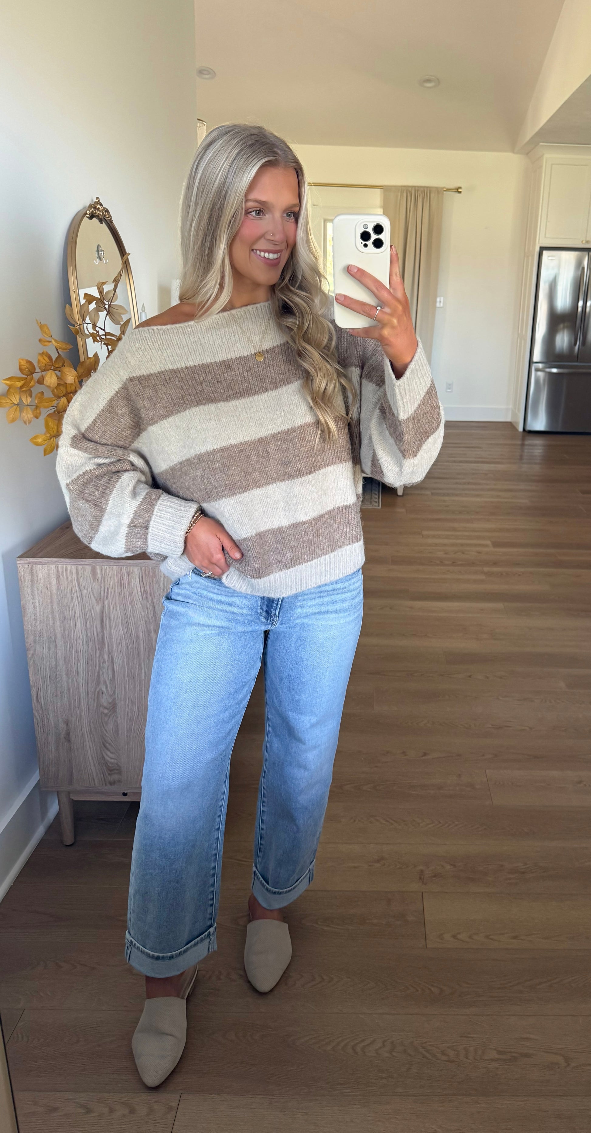 Stay cozy and chic in this off one shoulder Smokey Brown striped textured sweater, featuring a soft knit feel and timeless neutral tones. Perfect for Thanksgiving! 🦃
