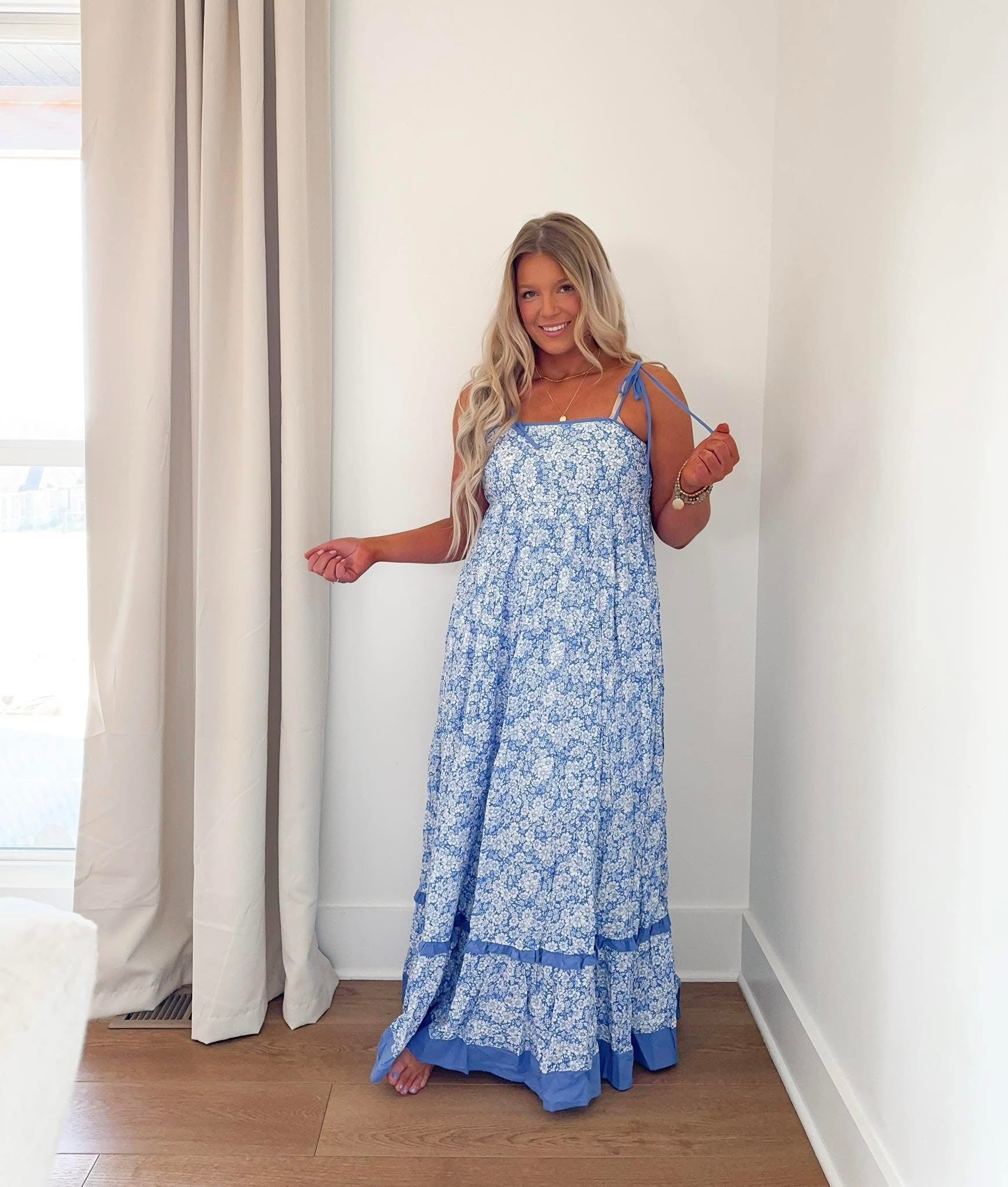 Step into sunshine and smiles with this adorable maxi dress! Sweet tied spaghetti straps and a cute floral print add a touch of playful charm that will sweep you off your feet. - Lightweight material with a floral print - A built-in lining ending above the knee - A square cut neckline - Tie closure spaghetti straps - A smocked back - Side zip closure.