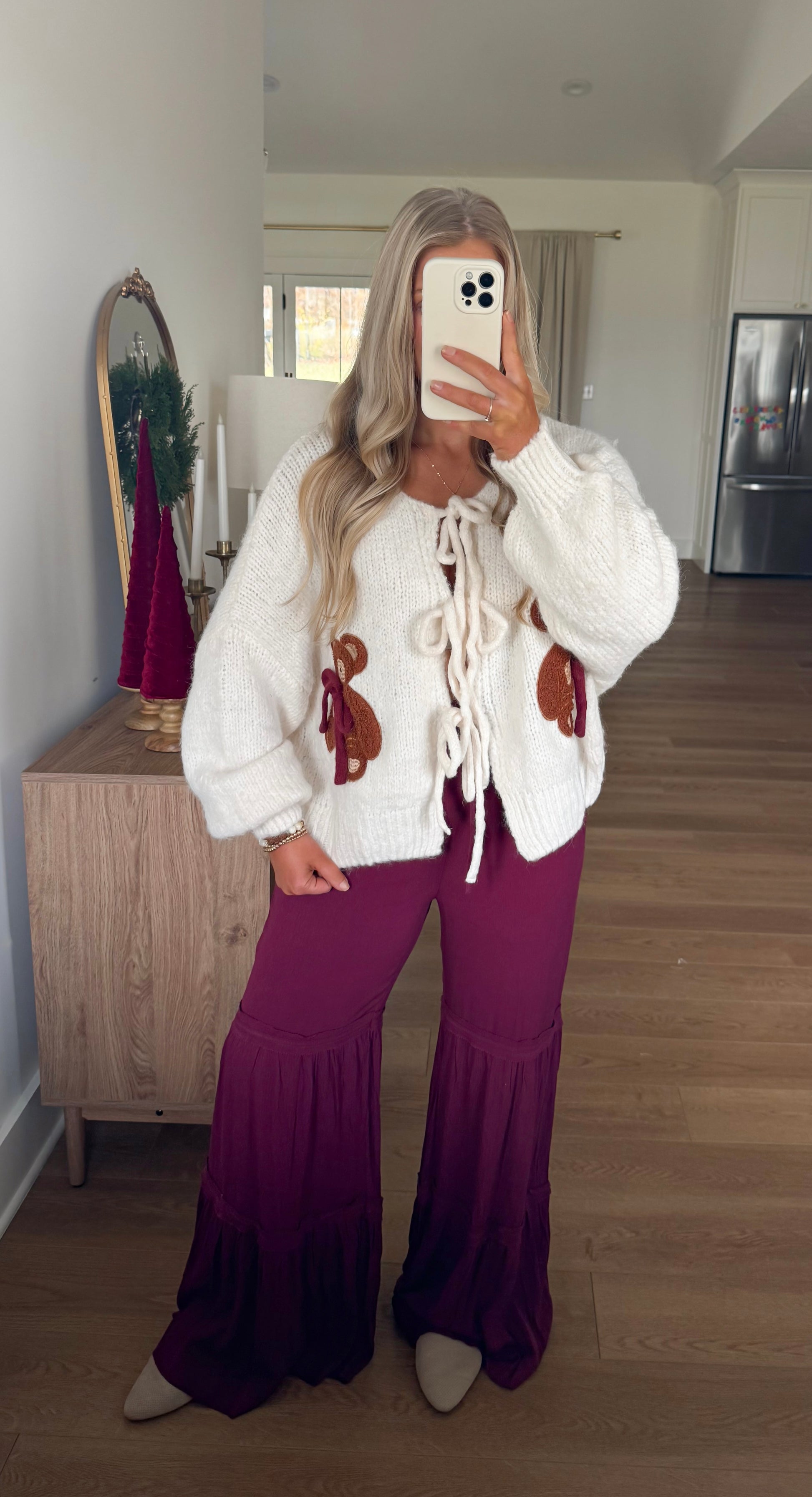 The absolute cutest teddy bear cardigan I ever did see! Ecru yarn cardigan featuring bow details, relaxed fit, and the sweetest bears. You’re going to love snuggling up in this super soft piece!