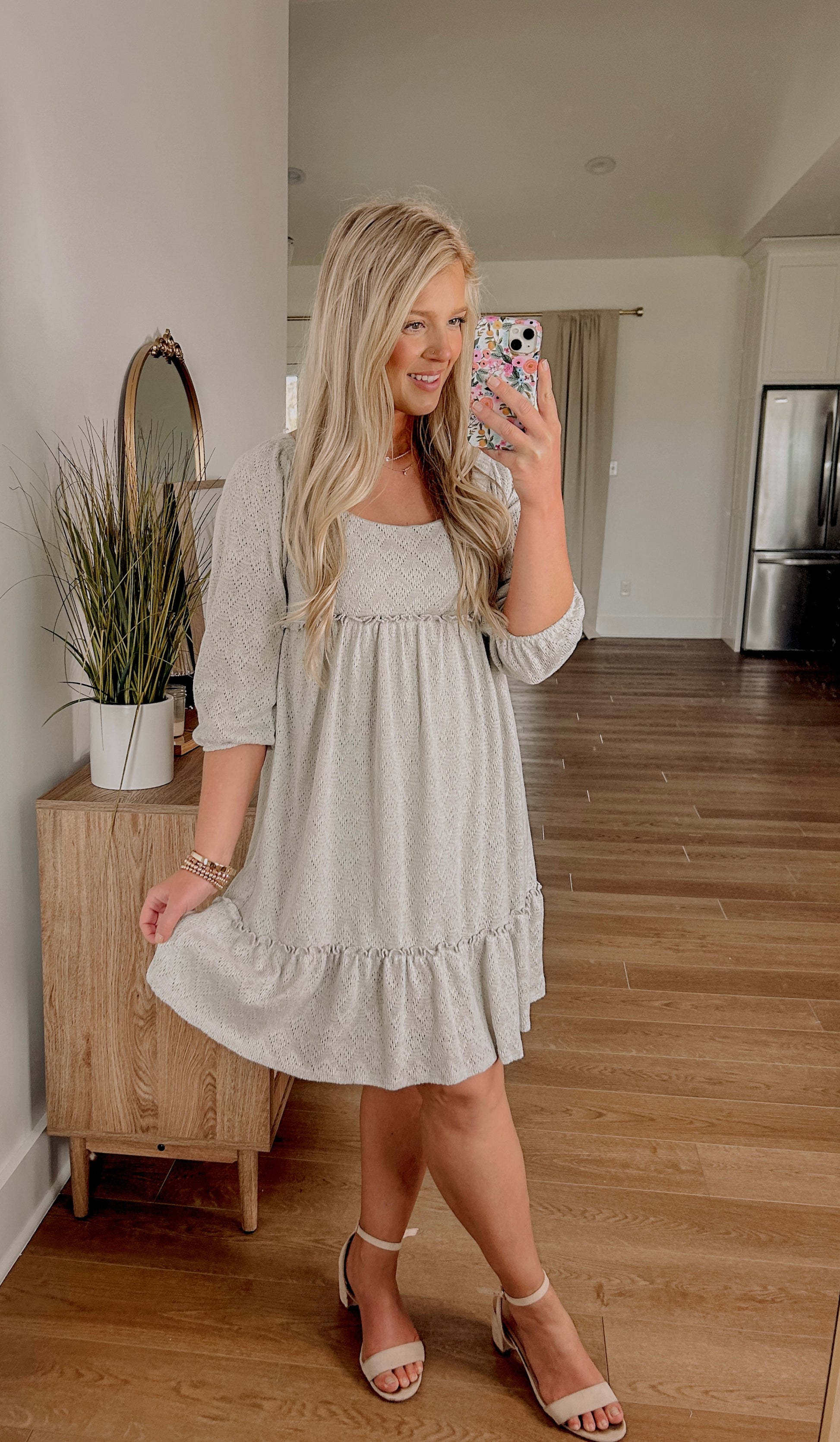 This textured knit beauty is gorgeous! The fit is precious and we love that neutral coloring! This babydoll dress features 3/4 sleeves, a square neckline, a back tie detail and ruffle hem. Style this with your favorite wedges or flats.