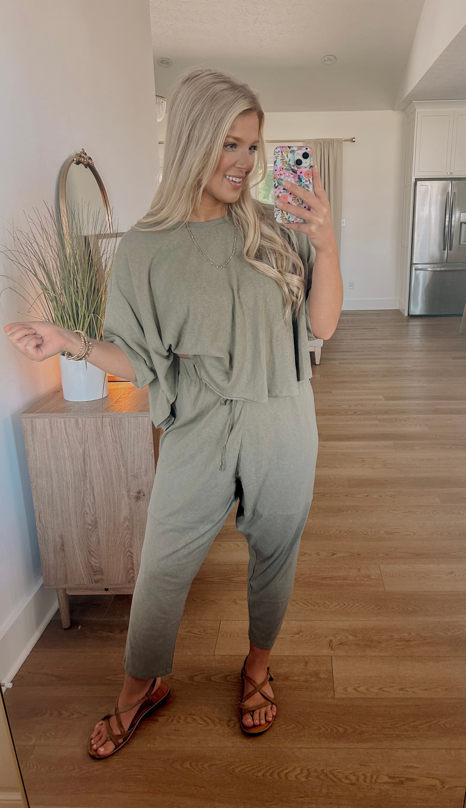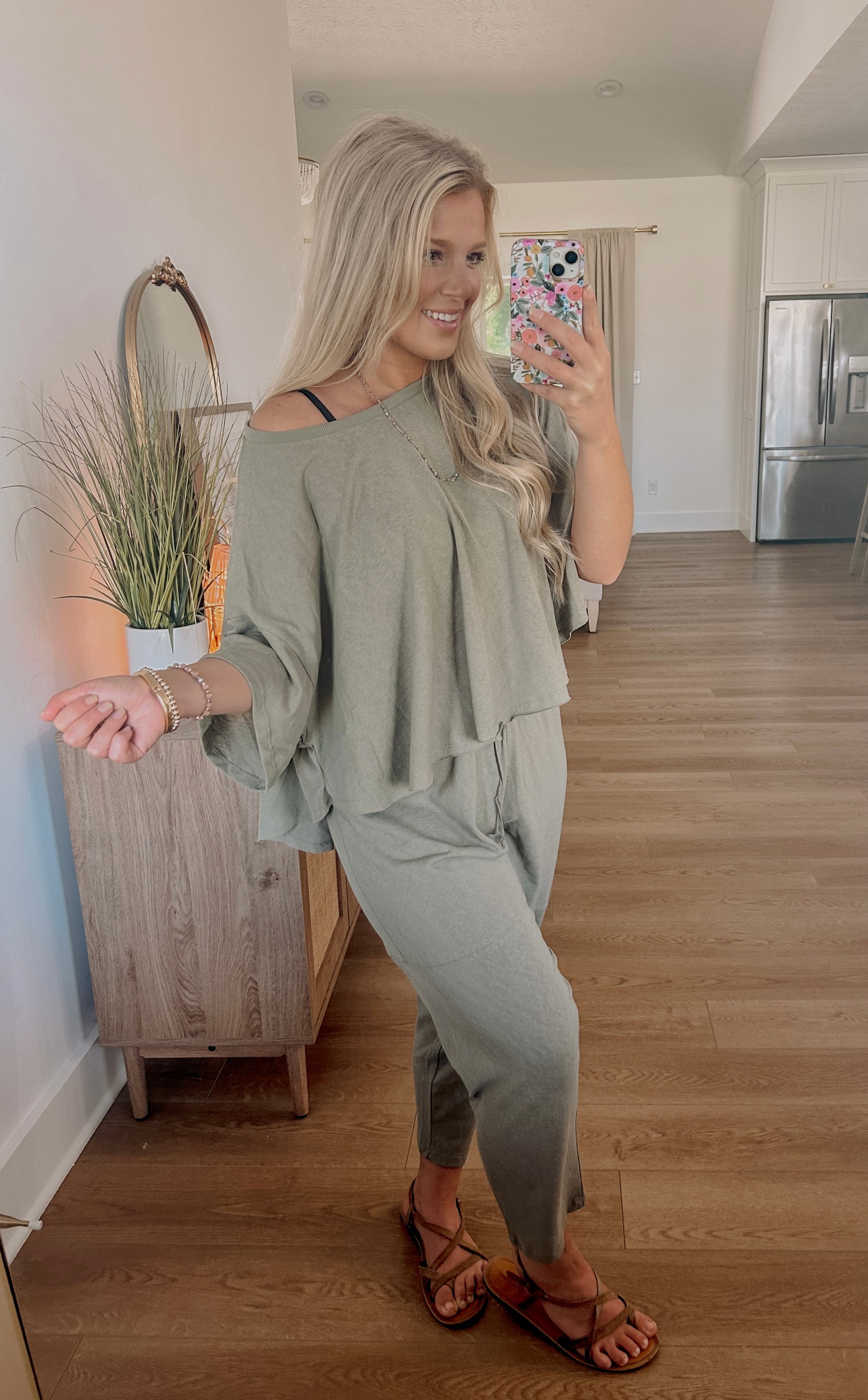 The batwing sleeve high low tee and drawstring crop pants are designed to be worn together as a matching set. This coordinated look creates a cohesive and put-together outfit that requires minimal effort to style.