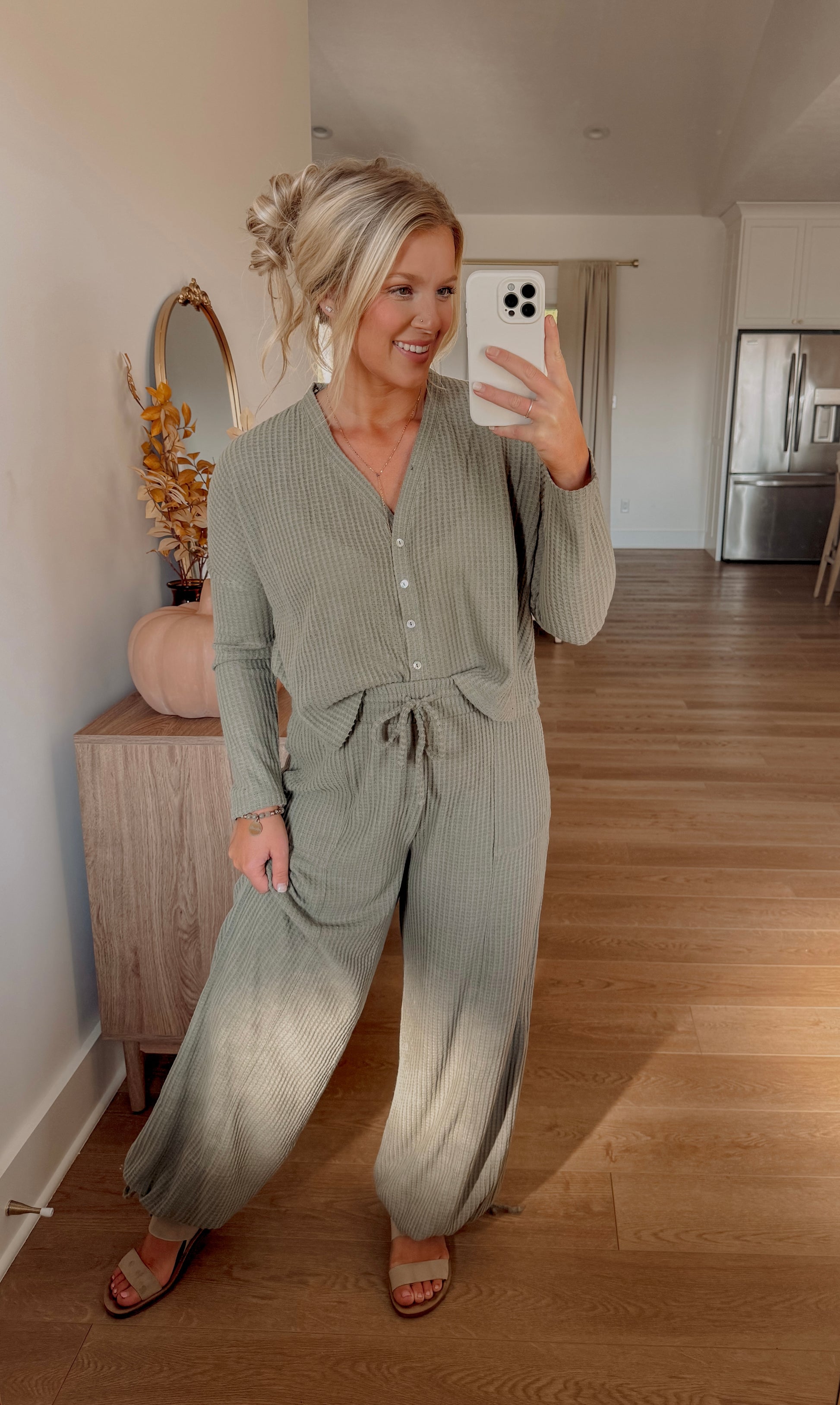 This Warm Days Waffle Lounge Set is the perfect way to relax and unwind in comfort. It features a soft and light weight waffle weave fabric that is cozy and breathablex making it ideal for any climate. All buttons are fully functional. The pants can also be worn as a jogger style, or wide leg.